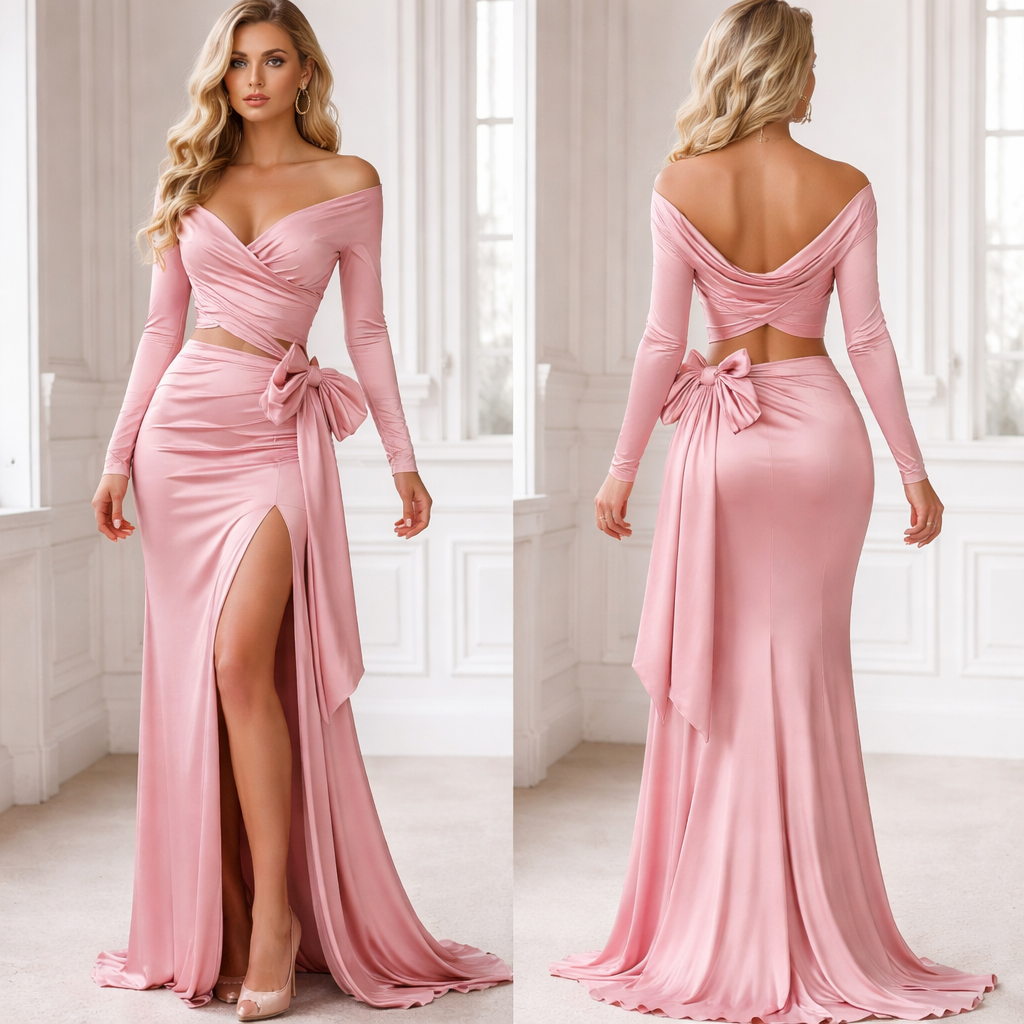 A pink top that’s opened kind of at the top and then it’s kind of on the side and it has long sleeves and then there’s a boat on the side and then there’s a skirt at the bottom but it’s long it’s a two piece set in , show front and back