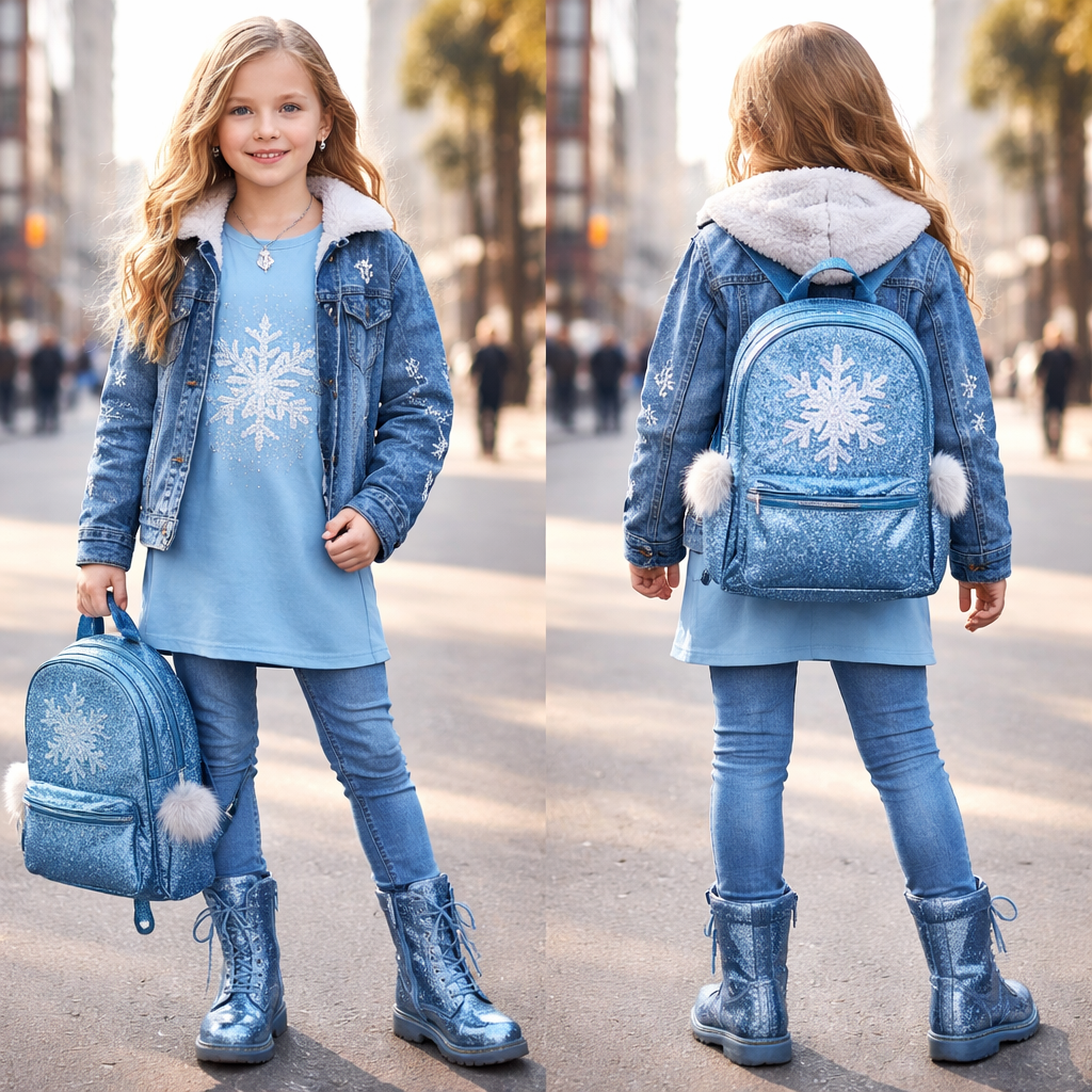 6th grade girls Disney princess elsa school look a blue long shirt with a white snowflake on it and a long blue shirt and blue military boots denim blue jacket with snowflake on it and a blue backpack with a snowflake , streetwear style, show front and back
