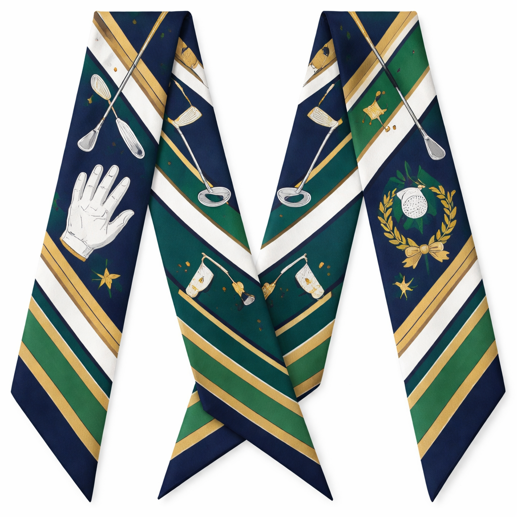 Create a silk scarf 5x86cm that is timeless for Golf lovers. PGA colors more simple with no words or logos a little touch of feminine, classic style, show front and back