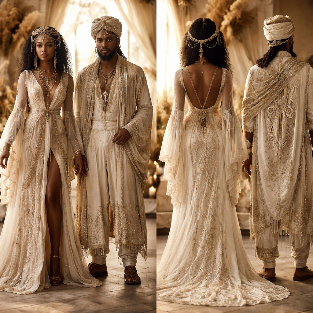 Sophisticated, still rooted in faith, black queen and black king magic, bohemian style, show front and back