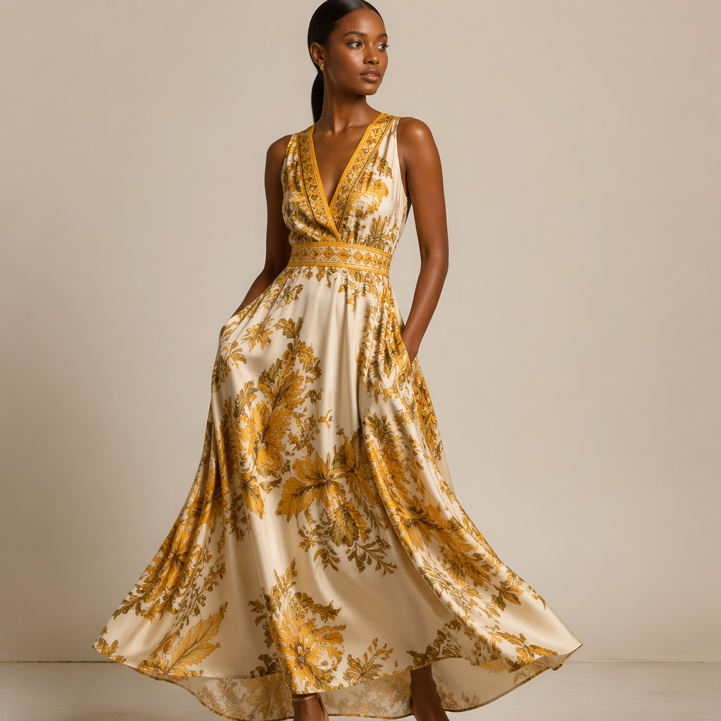 photorealistic fashion design, A Female Dress design, made of Silk, for Casual, suitable for Summer, in Elegant style. Ghana fashion aesthetics., elegant style, just the design no text