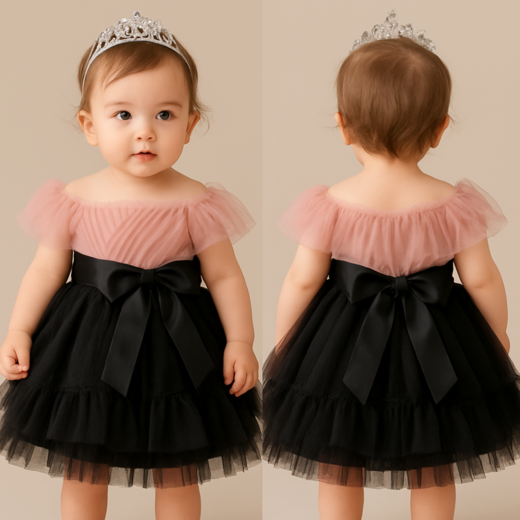 1歳の女の子のベビードレス着用画 黒のチュールドレス、膝丈のラッフルスカート(ボリューミー) 上半身は、ローズピンク、細かいギャザーを寄せたチュールのボディスに、胸元から肩にかけてふんわりとかかるオフショルダー風のチュールを重ねたデザイン、肩まわりは、柔らかいチュールを何枚か重ねて、肩にふんわりとかかる“オフショルダー風”のデザインでお願いします。 チュールは腕を覆いすぎず、胸元の中心に軽くねじって寄せたような立体感が出る仕上げで、肩から肘上まで被ってるような感じ、ローズピンク 上のローズピンクの部分に黒のサテン生地の太めのリボンを一周巻いて、真ん中ではなく、左前あたりで大きくリボン縛り 後ろにリボン縛りはなし 頭には派手すぎないシルバーのティアラ, show front and back
