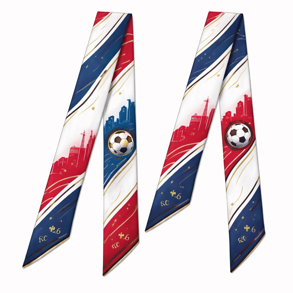 Design a 5cm x 86cm silk twilly scarf inspired by Kansas City, Missouri as a FIFA World Cup 2026 host city. Elegant, minimalist French-luxury aesthetic (Jolie Franc style). Color palette: Kansas City Red (#C8102E), Kansas City Blue (#0B365F), Clean White (#FFFFFF), with optional Soft Gold (#D4A017) highlights. Pattern: linear motifs, geometric shapes, or subtle waves running lengthwise for a handbag wrap. Include a discreet monogram or initials subtly integrated near the ends. The design should be seamless, luxurious, photorealistic silk texture with natural drape, and visually striking both flat and wrapped. High-detail, high-resolution, suitable for silk printing., show front and back