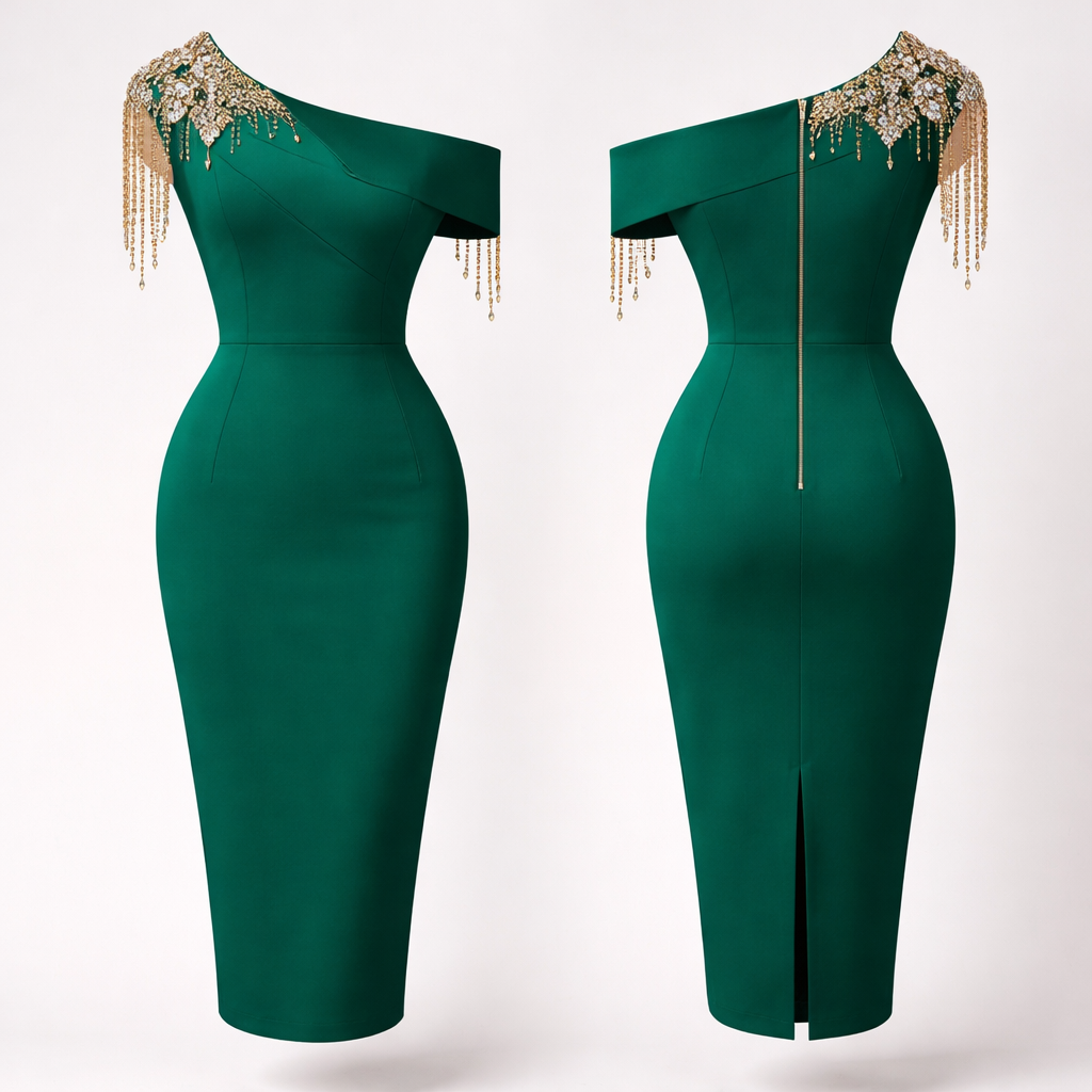 Create me a pencil dress plain bold color with embellishment , show front and back