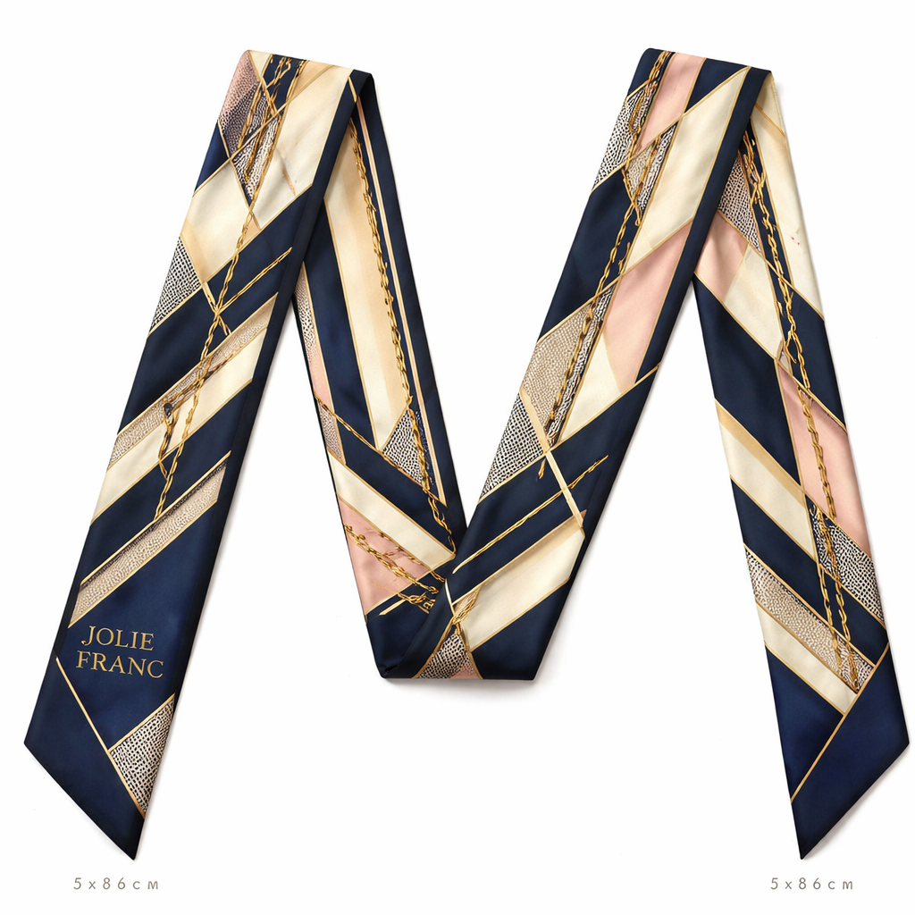Design me a silk scarf that is 5x 86cm to be wrapped on the top handle of a handbag. It need to be iconic for my brand Jolie Franc. It would be classic geometric abstract and tailored , classic style, show front and back