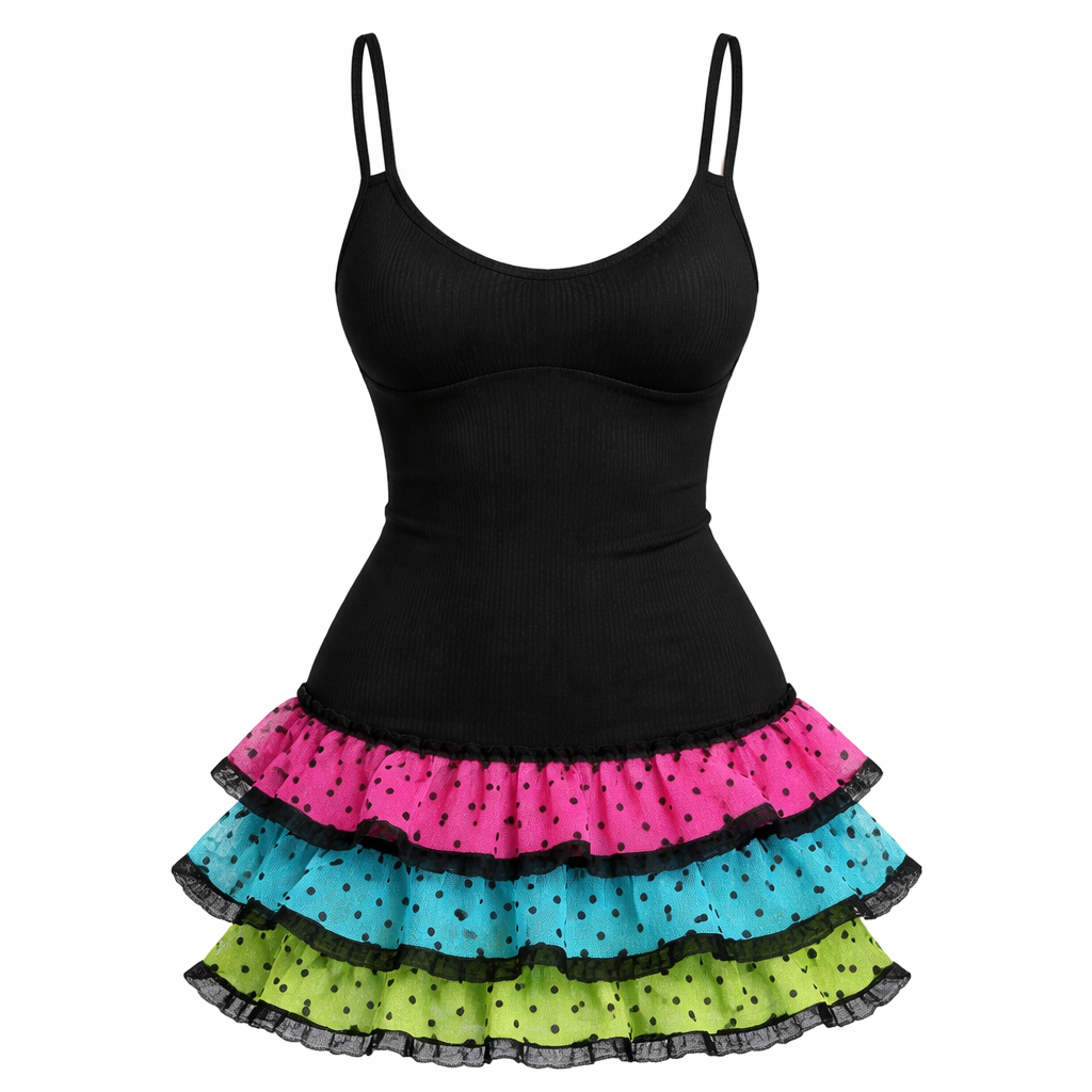form fitting pretty black tank top with ruffle lace layers at the bottom. one layer is hot pink with black polka dots. one layer is aqua with black polka dots. one layer is bright green with black polka dots. draw just the attire - no people or background.