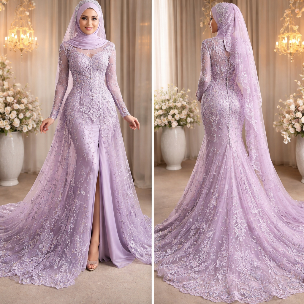 Hasilkan kebaya pengantin Labuh smpai lantai, luar netting patching lace dan bahagian belakang Ada ekor.. pastıkan bahagian baju hadapan ada belah style kebaya, dan berwarna purple lilac