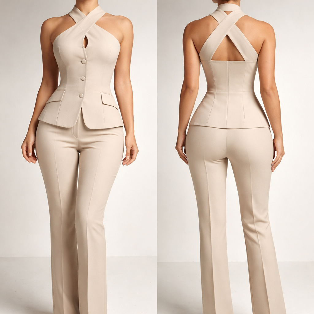 Two piece suit set. Only 3 buttons straight down in the middle on the top on a breasted halter crossed neck top. Thick material. No skin showing at gap of top!!!!!!!Full coverage.All beige, symmetrical pockets only on sides/top piece, no drooping pockets. No back pockets. Extenuate small waist and curvaceous hips. No crop top. Show top to bottom. Thicker cross. No skin showing on top, business style, show front and back