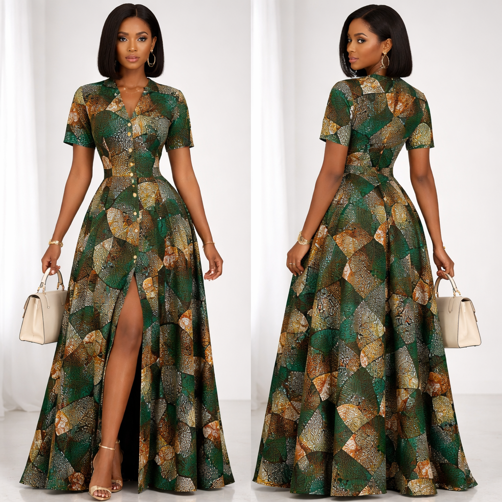 Crée une robe longue soft et élégante en tissu dampé sans ceinture Le style doit être une belle robe africaine fais en tissus africain un autre model stp avec bouton et fente devant fais manche courte Robe chic , business style, show front and back
