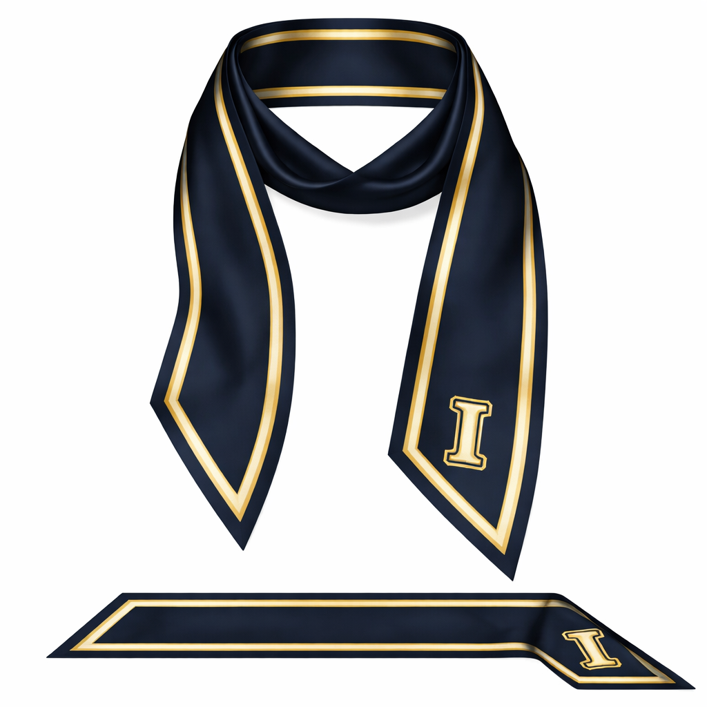 Design a silk scarf that is 5 x 86 cm with oblique edges. It needs to be very simple and tailored. It’s for graduation ceremonies at the collegiate level. No words or logos . Add a Bold letter “I” at an edge, classic style, show front and back