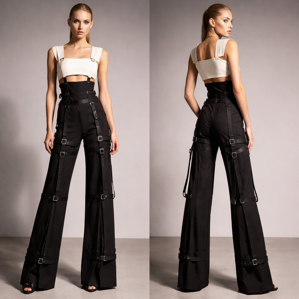 POWER TROUSER SYSTEM High waist elongated trousers with harness layering. Key features Extremely high waist Long leg proportion Strap / harness overlay Cropped structured top Fabric: Canvas / Denim, haute_couture style, show front and back