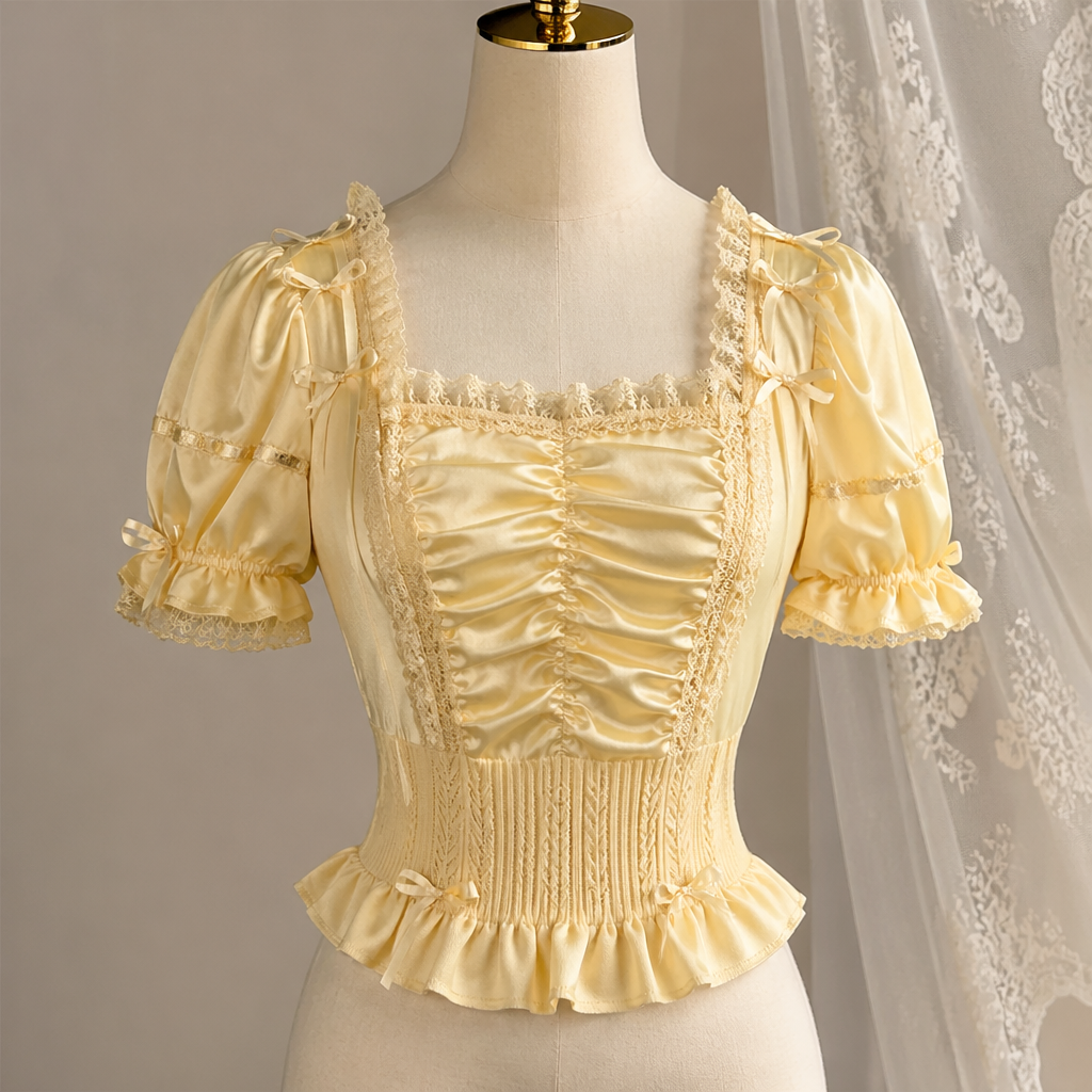 A Top design, made of Satin, for Party, suitable for Summer, in Lolita + Renaissance + Knitwear style. sand yellow, party vibe. Design with modest coverage.