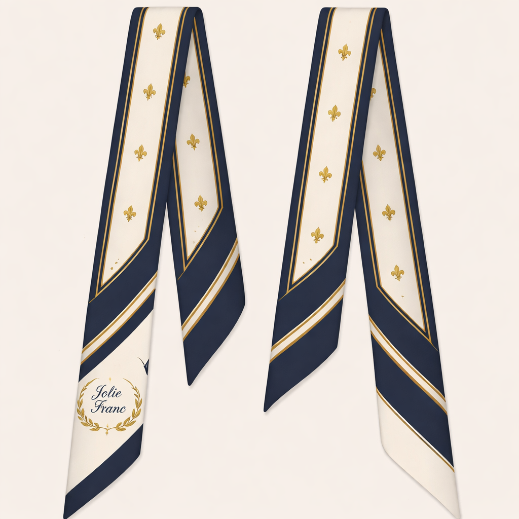 Design a silk scarf that is 5 x 86cm to be wrapped around a top handle of a handbag. It going to be the signature scarf for my brand Jolie Franc. The style is classic timeless, tailored. With a touch of heritage. Keep it simple and no chains. Think like it’s for a sorority and exclusive club. Now make it iconic. Something Samantha from sex and the City would wear, classic style, show front and back