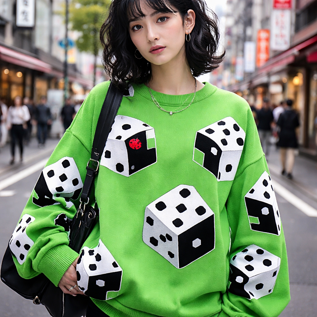 Japanese Street fashion design: **Japanese Street Style Focus:** Oversized, relaxed fit sweater in bright green cotton. Bold black and white dice patterns cover the garment, with a single red ladybug detail on one die. Clean lines offer a modern, playful feel.