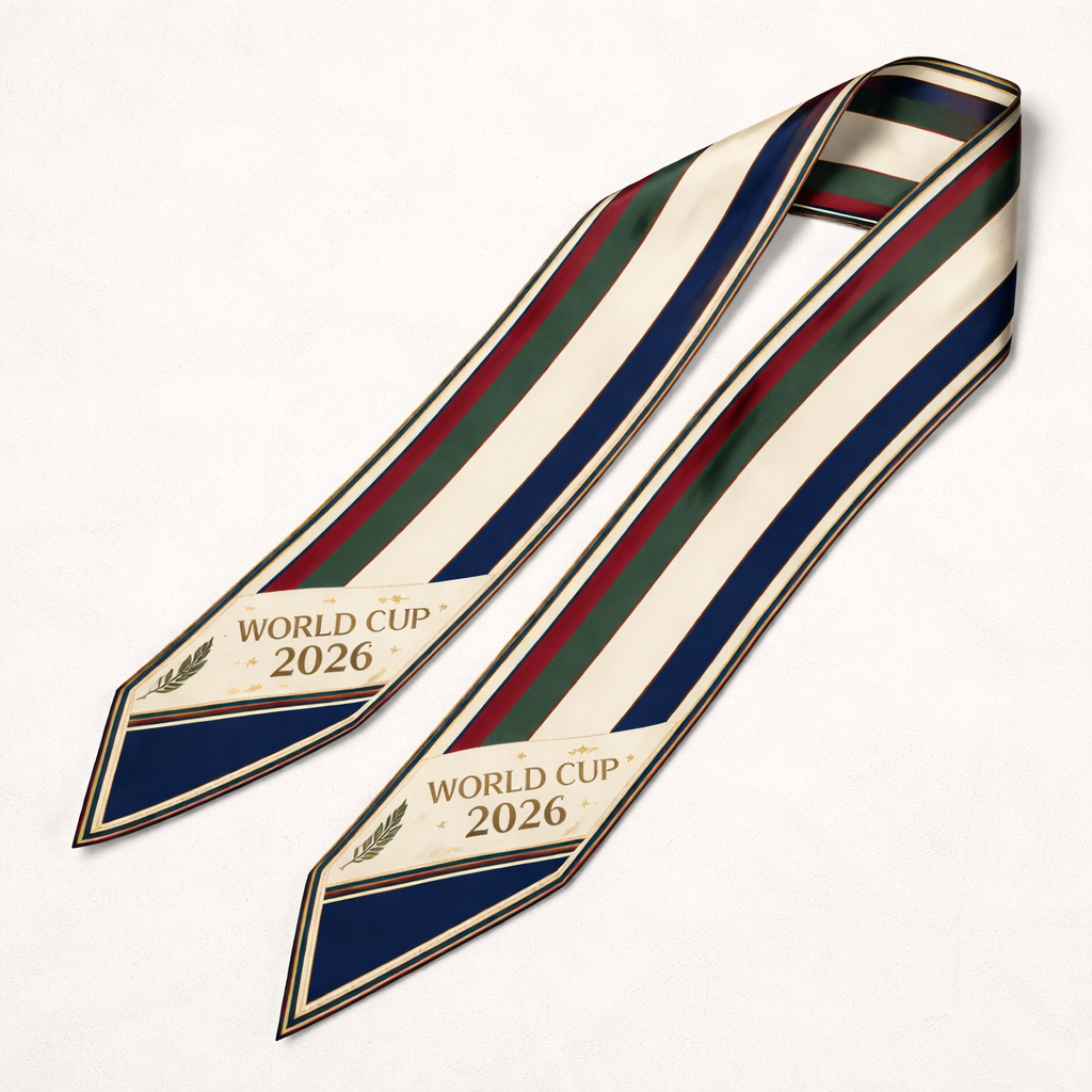 Design a silk scarf that is 5x86cm that is generic for the World Cup 2026. No logos. Heritage look and classic and simple. With angled corners , classic style