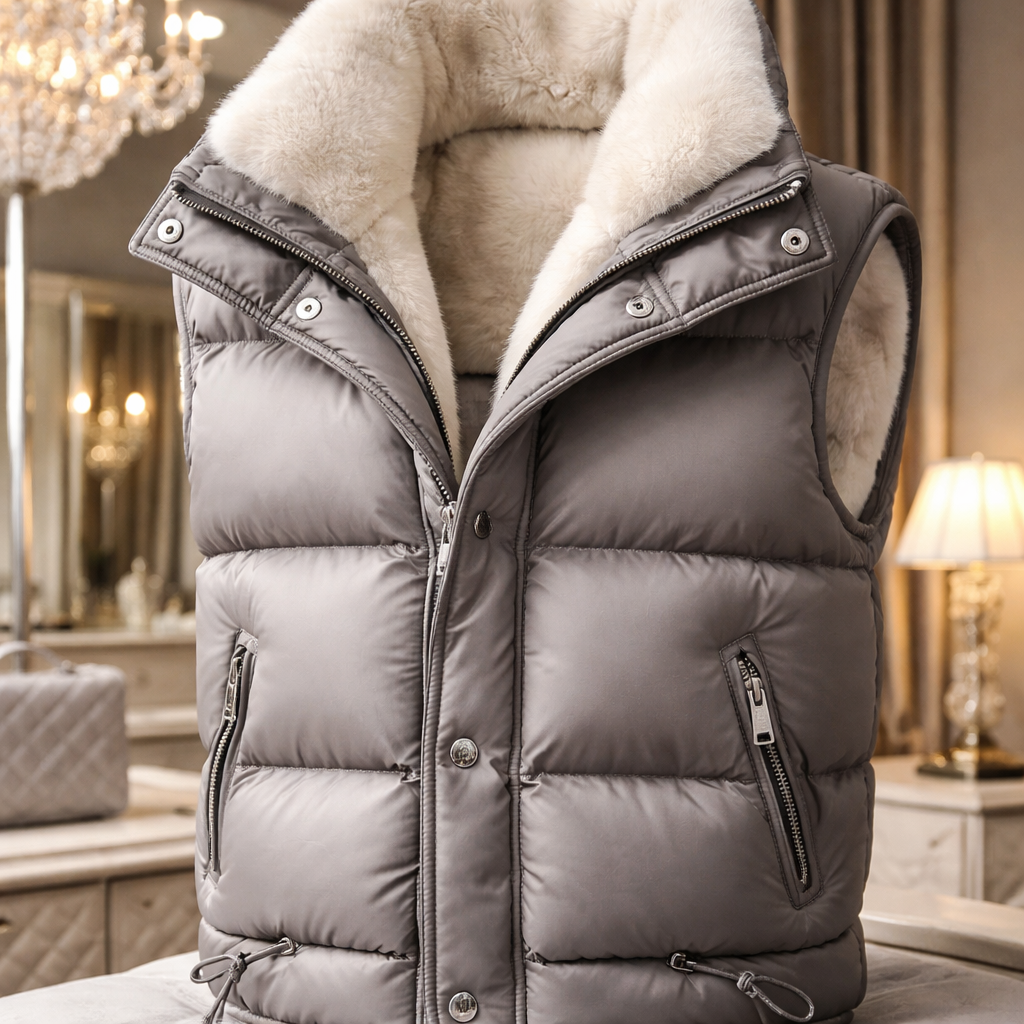 Plain Grey puffer vest with white fur inside for comfort Make it look luxurious and attract rich people to buy