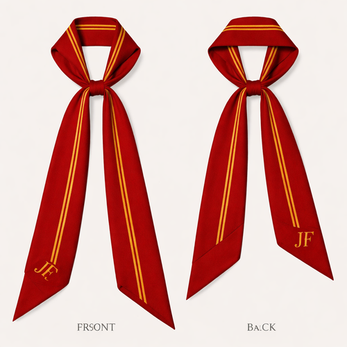 Design a twill scarf that is 5 x 86cm with oblique edges. Have it be mostly red with yellow lines. Keep it super simpl...
