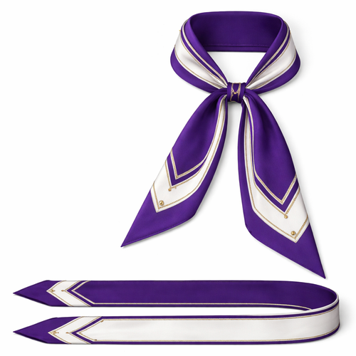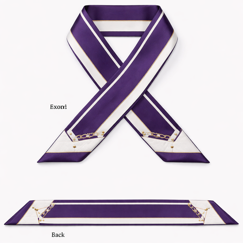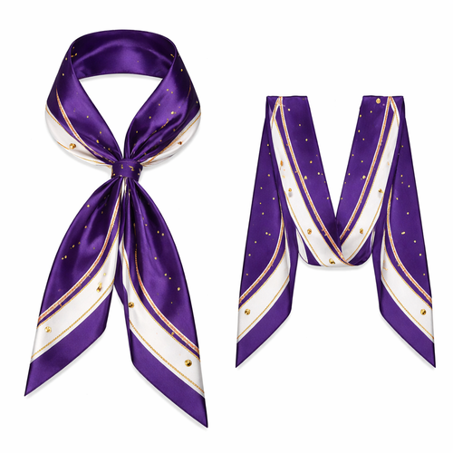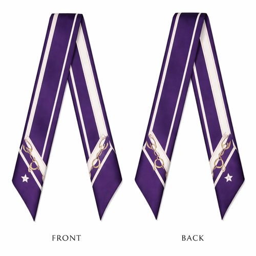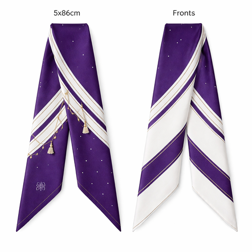Design a silk twilly scarf that is 5x86cm. It needs to be tailored and simple with the colors royal purple and white