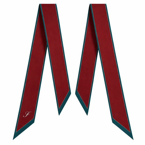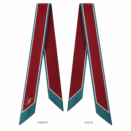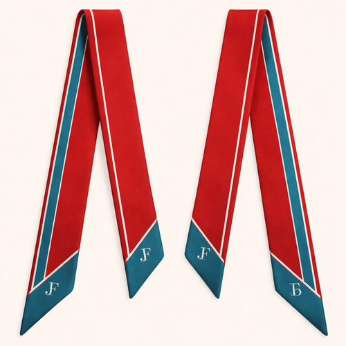 Design a twilly scarf that is 5 x 86cm with oblique edges. Have it be mostly deep red with teal accent Keep it super ...