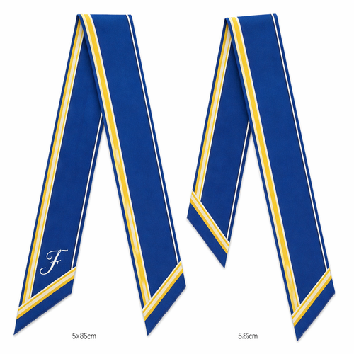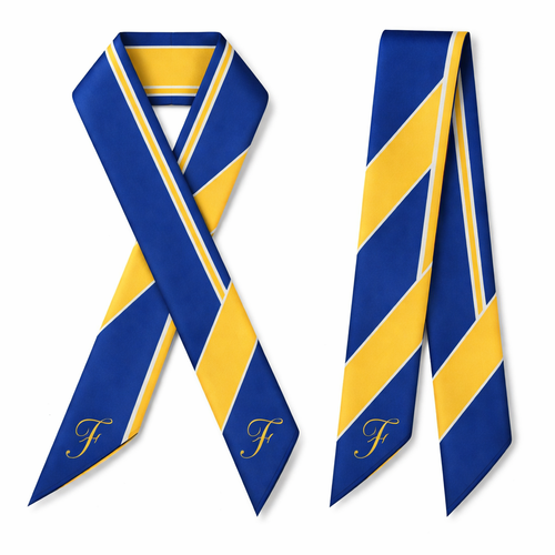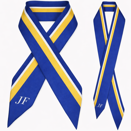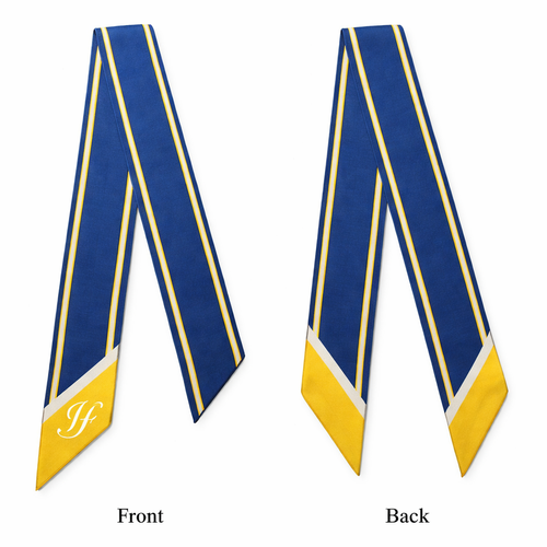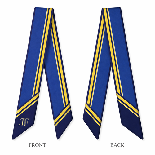 Design a twilly scarf that is 5 x 86cm with oblique edges. Have it be mostly royal blue and yellow and navy Keep it su...