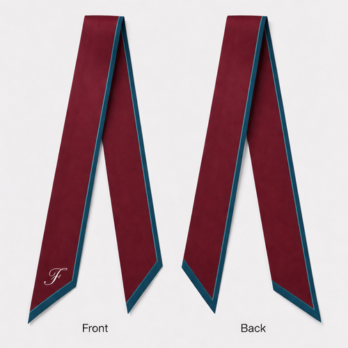 Design a twilly scarf that is 5 x 86cm with oblique edges. Have it be mostly deep red/ maroon with teal accent Keep it...