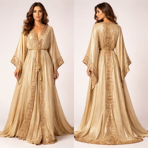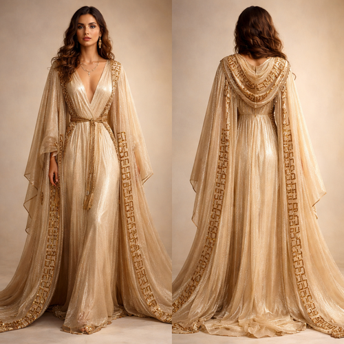 Neo Hebrew, a bit modernized, a bit humble in gold glistening hemp, the fabric looks light and flowy, shimmery light gol...