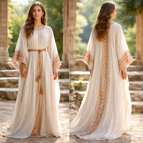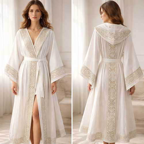 Neo Hebrew, a bit modernized in white linen, the fabric looks light and flowy, rose shimmery gold Hebrew embroidery arou...