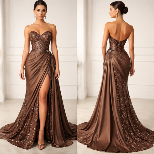 A bodied brown gown with a draping from waist line with a sequins lace fabric