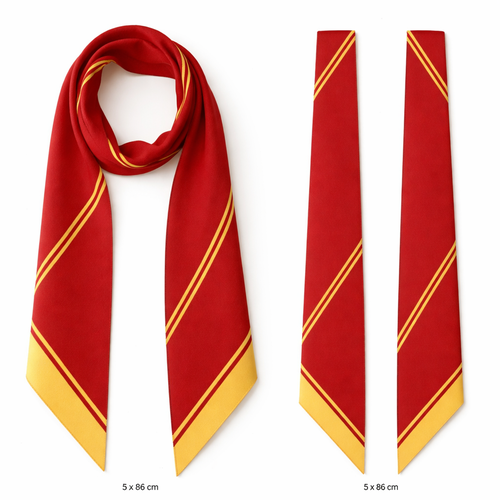 Design a twill scarf that is 5 x 86cm with oblique edges. Have it be mostly red with yellow lines. Keep it super simpl...