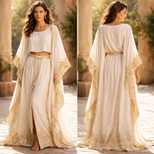 Israelite, a bit modernized, make an outfit having four pieces, flowy just below the ankle pants like skirt, show a embr...