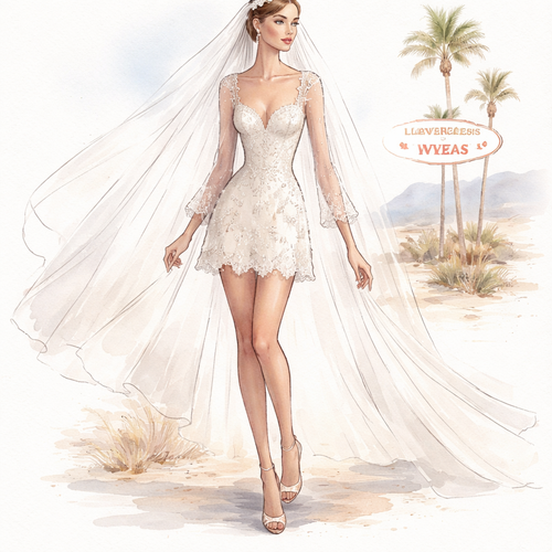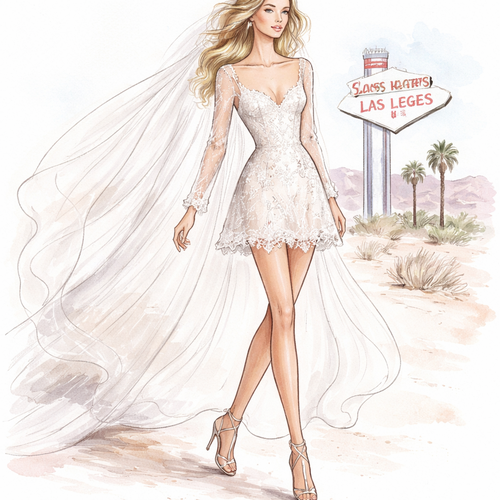 Fashion illustration of a female character, Las Vegas desert wedding, short ivory lace mini dress with long sheer sleeve...