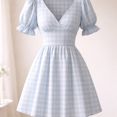 A short sleeve dress, puff sleeve, above the knee, but not a mini dress. Fitted at the waist and bust, a V-neck, sleeves...
