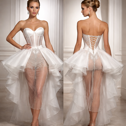 Short corset flare strapless gown with sheer pencil body con illusion inner gown