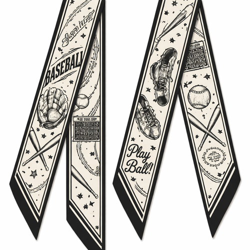 Design a silk scarf that is 5 x 86 cm with oblique edges. That has a baseball vibe. No colors. Keep it vintage