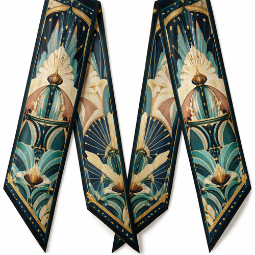 Design a silk scarf that is 5x 86cm with oblique edges. Make it an abstract fountain theme with and art deco style. Way ...