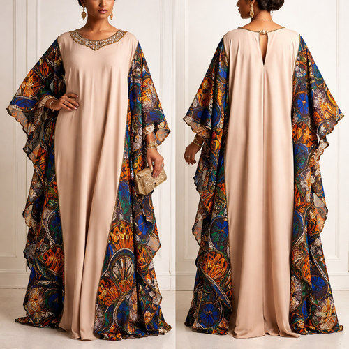 I need a bubu gown with dramatic hands that is mixed with 60% plain nude material and 40% Ankara materials, it should be...