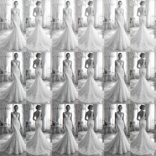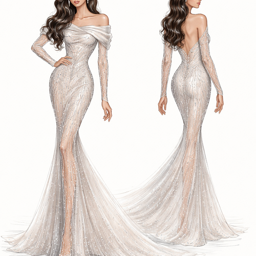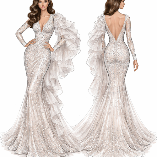Sketch a wedding dress style with flowing silhouette made with a heavily detailed white beaded fabric, long sleeves with...
