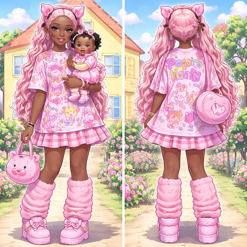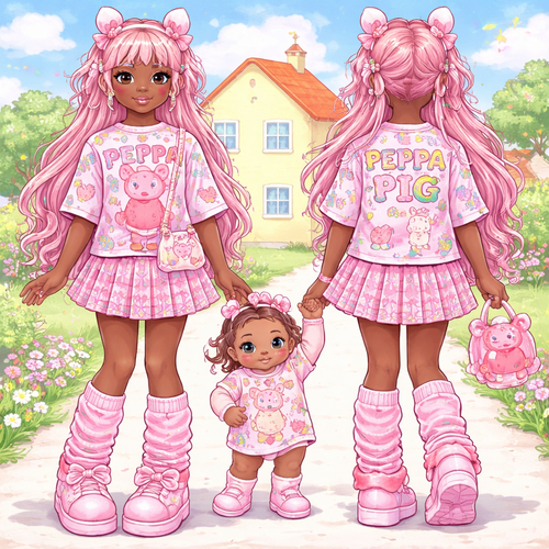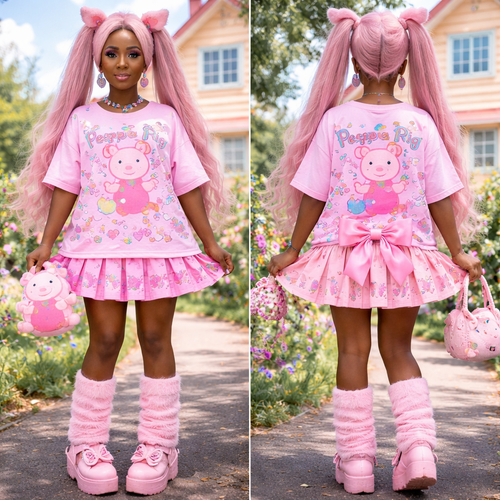 A kwawii shirt with peppa pig on it and and a peppa pig skirt pink leg warmer girl shoes long pink hair brown skin pig ...