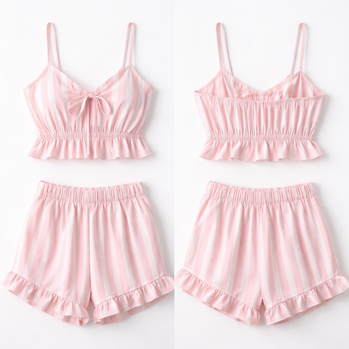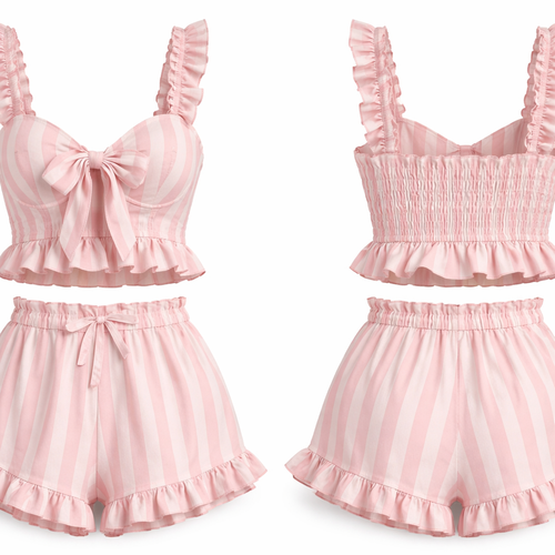 Pink and white stripes fabric,two piece top and short,ruffle ends.