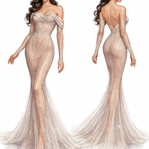 A high-fashion croqui illustration of a tall, elongated female model wearing a luxury white beaded evening gown. The gow...