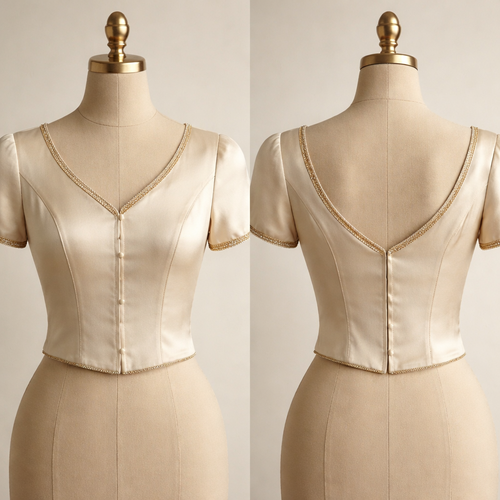 “I want a fitted corset-style bodice with a deep V neckline and traditional embroidered detailing inspired by the brown ...