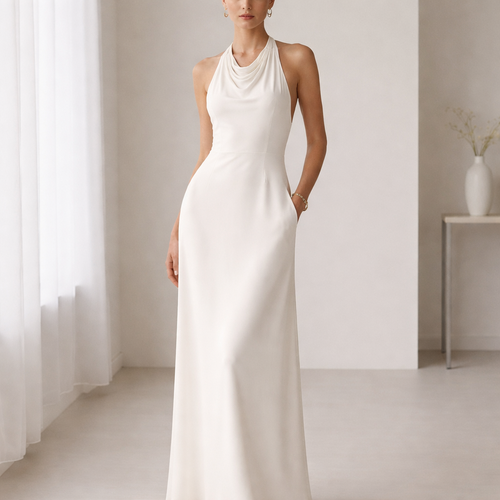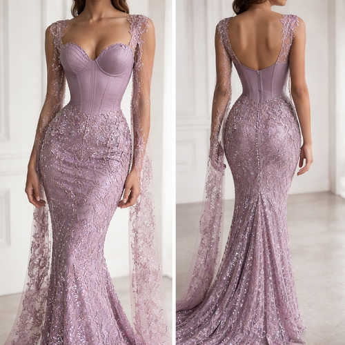 A floor-length couture gown crafted from flowing silk chiffon, featuring a sculpted corset bodice and a deep side slit. ...