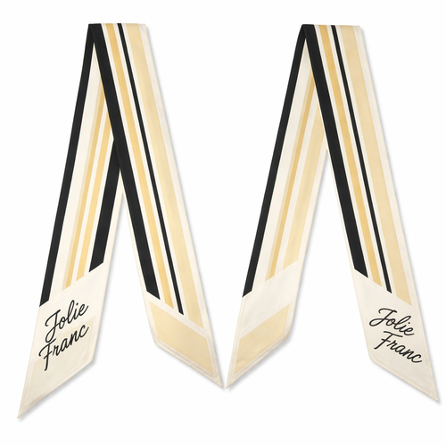 Design a 5cm x 86cm silk twilly scarf for KC lifestyle that has repeating word for my brand Jolie Franc in longitudinal ...