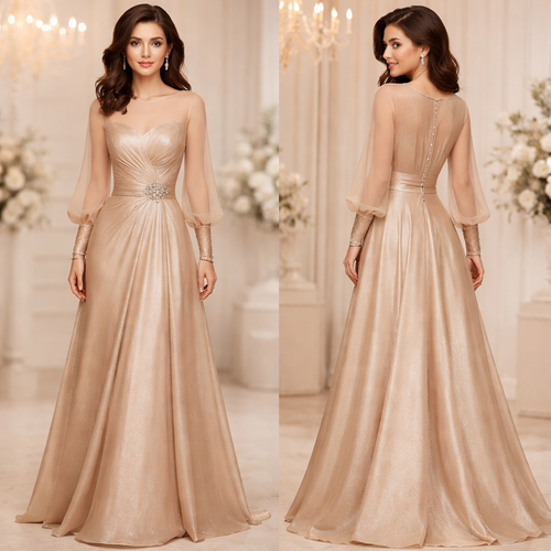 Make me an evening gown but conservative in a beige metallic gazaar fabric. For a small petite woman. Not too body huggi...