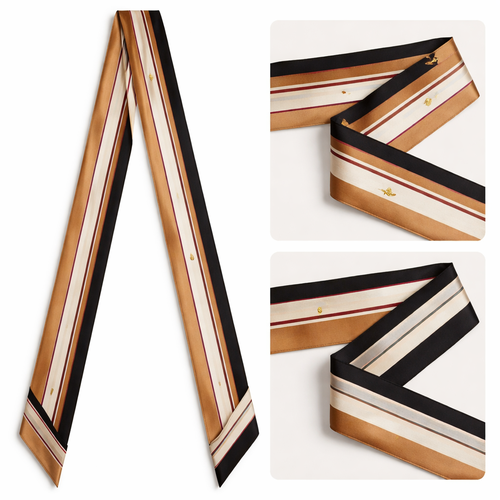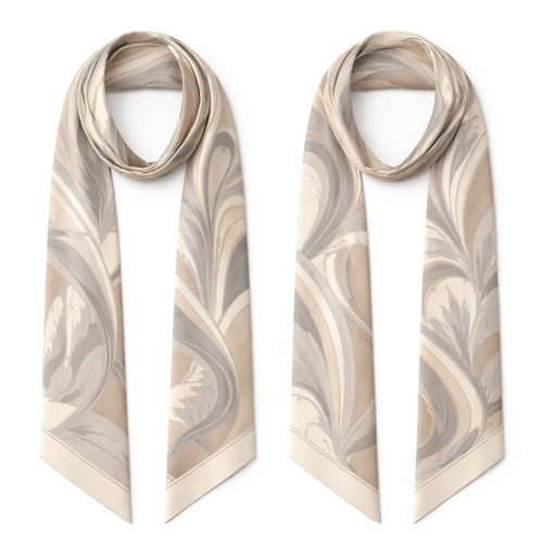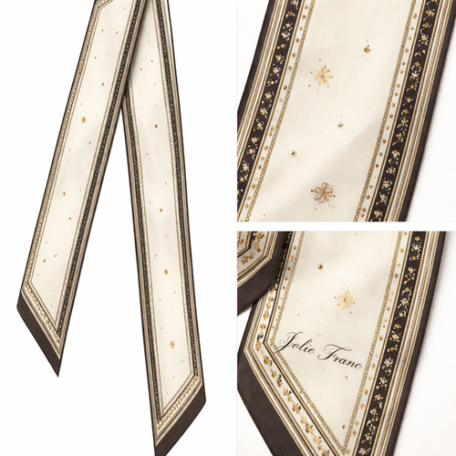 Design a luxury silk twilly for a high-end fashion brand, Jolie Franc. Size: 5 cm x 86 cm (2” x 34”), long and narrow, m...