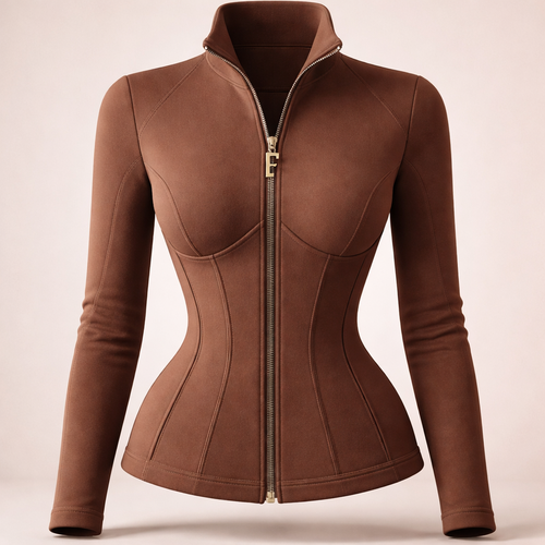“Design a brown zip-up jacket with a built-in corset silhouette, made from soft, smooth fabric suitable for fall and win...