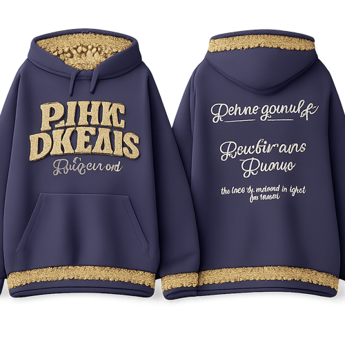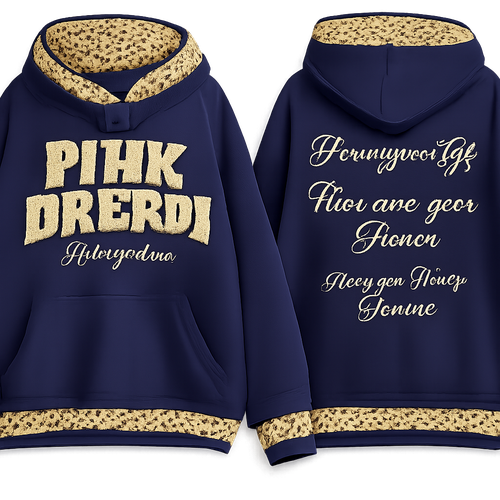“Design a coordinated navy blue sweatshirt and pants set made from the same soft, flexible fabric. The sweatshirt featur...