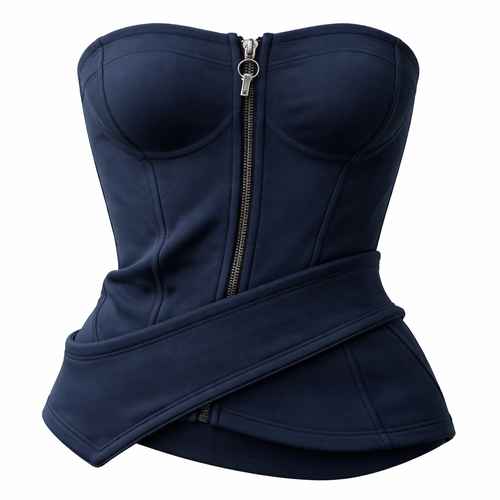 “Design a navy blue strapless corset with a slightly oversized fit. The corset features a visible front zipper, with th...