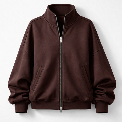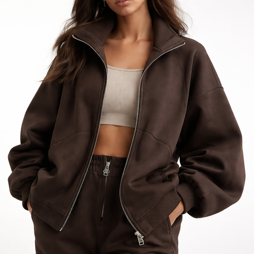 “Design a dark brown oversized zip-up jacket for women, made from Milton cotton mixed fabric, soft and smooth, suitable ...