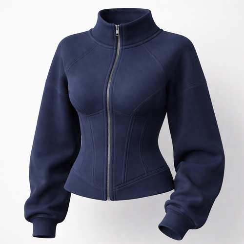 “Design a navy blue sweatshirt with a built-in corset silhouette. The corset features a visible front zipper, with the z...